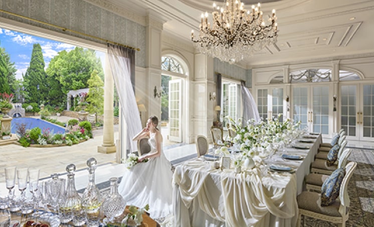 専用会場アットホームな雰囲気と衛生対策でゲストが安心して過ごせる空間。プールの水面がきらめくフレンチスタイルのガーデン付き邸宅と、アンティークの本棚がならぶドローングルーム。晩餐会を思わせる華やかなダイニングで、心温まるお時間を。