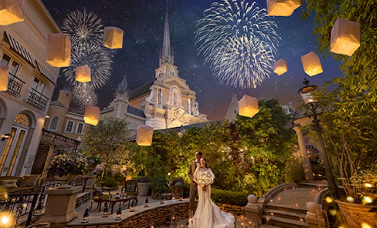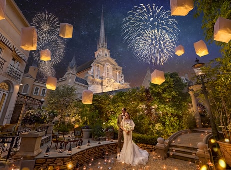 イルミネーションとともに季節の花々が咲き誇るお庭とテラスは、夜はきらめくイルミネーションが輝き、昼間の雰囲気とは一変します。ナイトウェディングならではの演出で幻想的なパーティーにも。