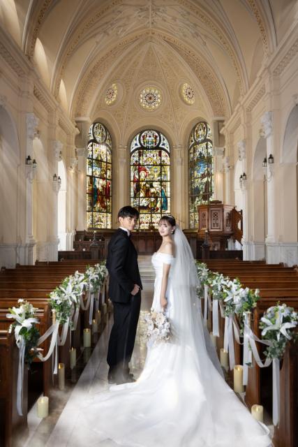 ステンドグラスの柔らかな光が差し込む大聖堂など